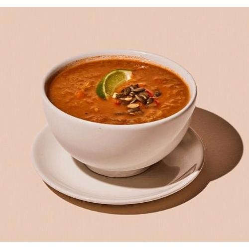 A rich, hearty red lentil soup full of wholesome veggies and warm spices. Made with carrot, tomato, cumin and paprika – deeply satisfying, nourishing and full of natural flavor. Toppings: slice of lime and pumpkinseeds.